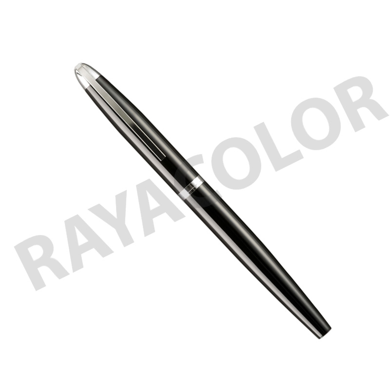 Roller Ball Premium Metálico. Con capuchón. Pasta negra. Baño especial electro-plateado, bajo el esmalte, que permite grabado láser con fondo color plata (sólo en la parte superior que contiene el clip metálico). Clip con sistema de resorte. Detalles plateados.