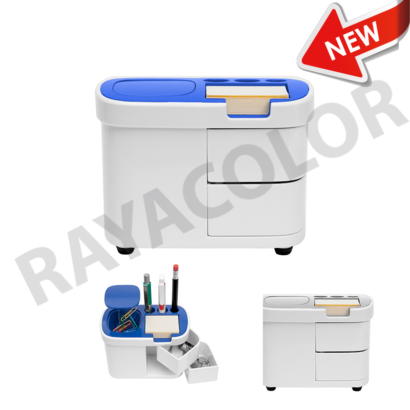 Plástico. Organizador para escritorio. Cuenta en la parte superior espacio para tres bolígrafos, notas autoadhesivas y un botón pulsador que sirve para guardar clips y los incluyes. En la parte inferior dos cajones.