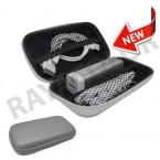 Estuche con cierre de dos compartimentos. Uno de ellos con bolsillo de red con auriculares y el otro con cavidades que incluyen Multi USB con cables y Power Bank 2200 MAH.